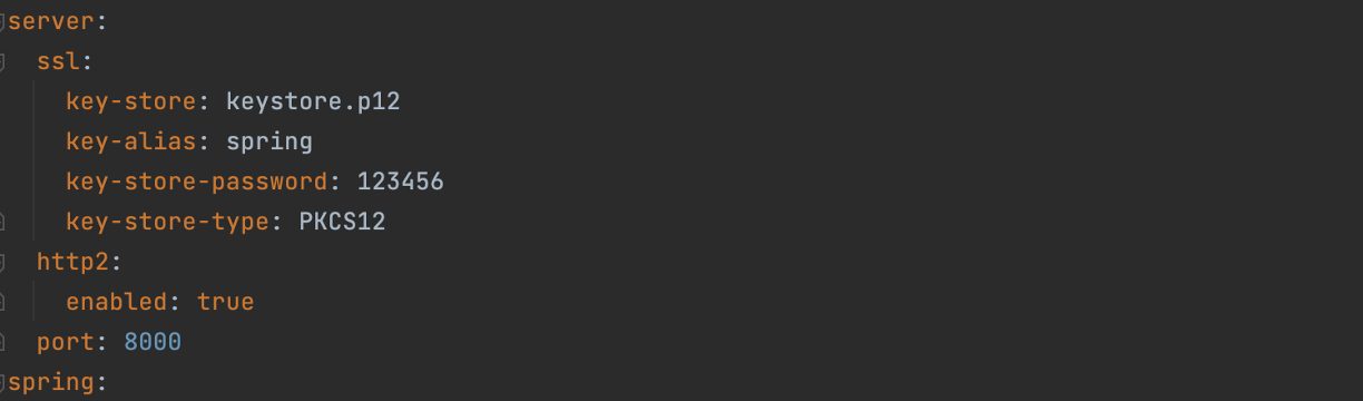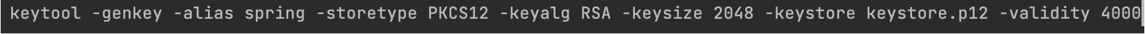 그 다음 application.properties 파일에 다음과 같은 내용을 추가해줍니다! 비밀번호는 본인이 설정한 비밀 번호 넣어주면 되고 -alias는 저는 spring을 줬기 때문에 spring을 넣었습니다!