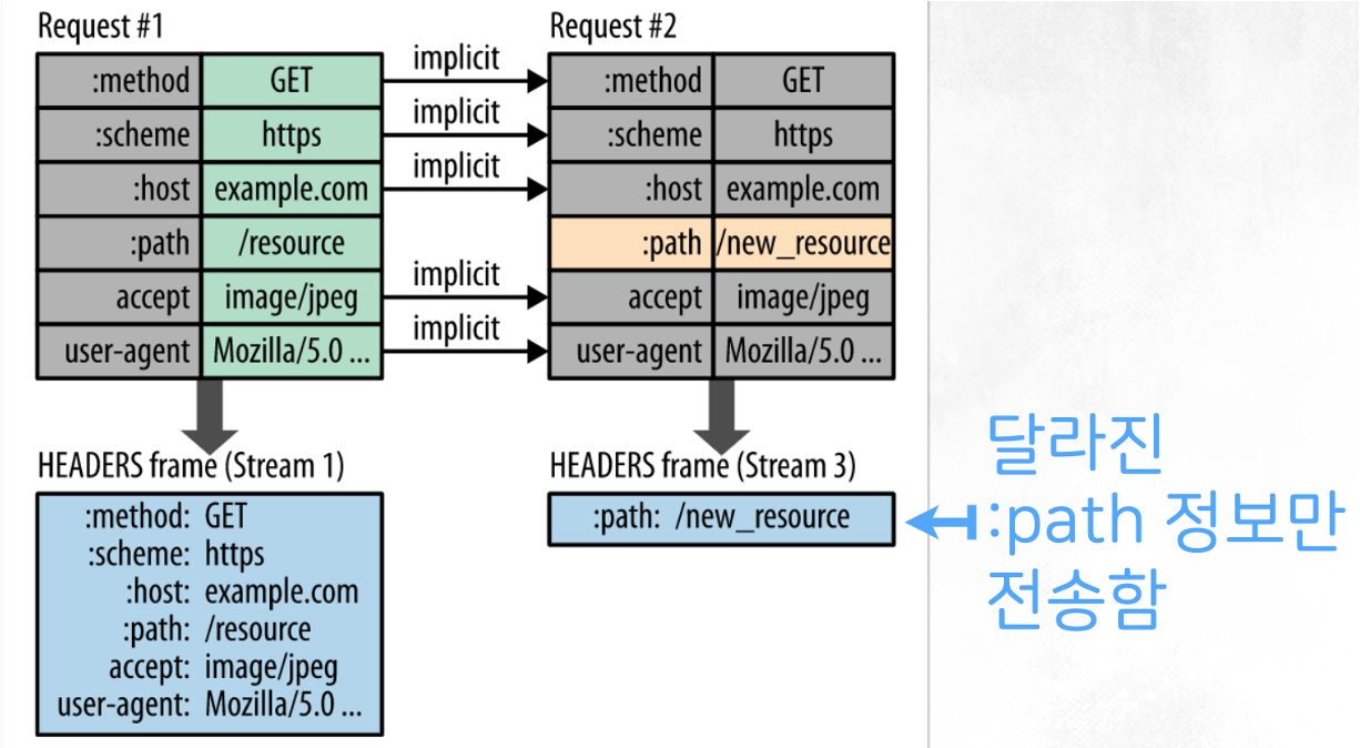 - http 헤더 압축 → HTTP 헤더에는 요청마다 반복되는 내용이 매우 많으므로 헤더 압축만으로도 충분한 성능 향상 효과를 얻을 수 있다 → 요청이 많아질수록 압축률은 더 커지고 효과적!