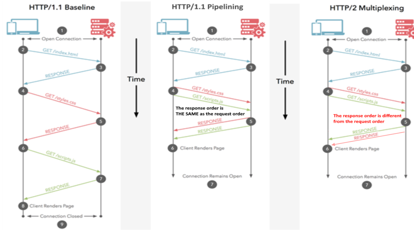 - Head of line blocking → 하나의 커넥션당 하나의 요청을 극복하기 위해 pipelining 기법을 도입해서 순차적으로 여러 개의 요청을 보낼 수 있도록 함. 그러나 요청을 순차적으로 처리하다보니 앞의 요청이 처리가 지연되면 뒤의 요청도 처리가 지연되게 되는 문제 발생