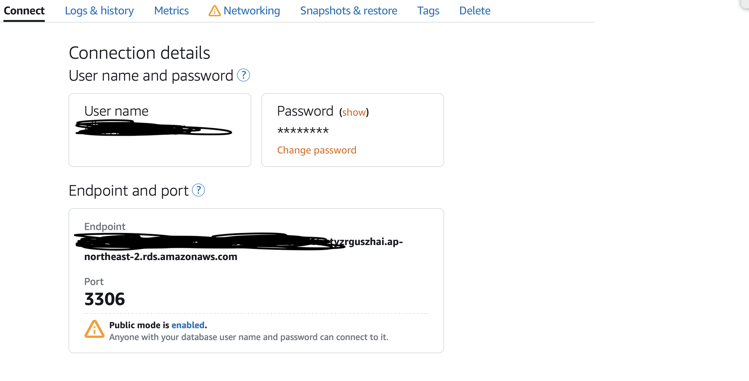 database가 다 만들어지면 얘도 : 표시 눌러서 들어가면 이런 내용들을 볼 수 있는데 저는 네트워킹에서 public을 열어주고 workbench에 따로 연동했어요.