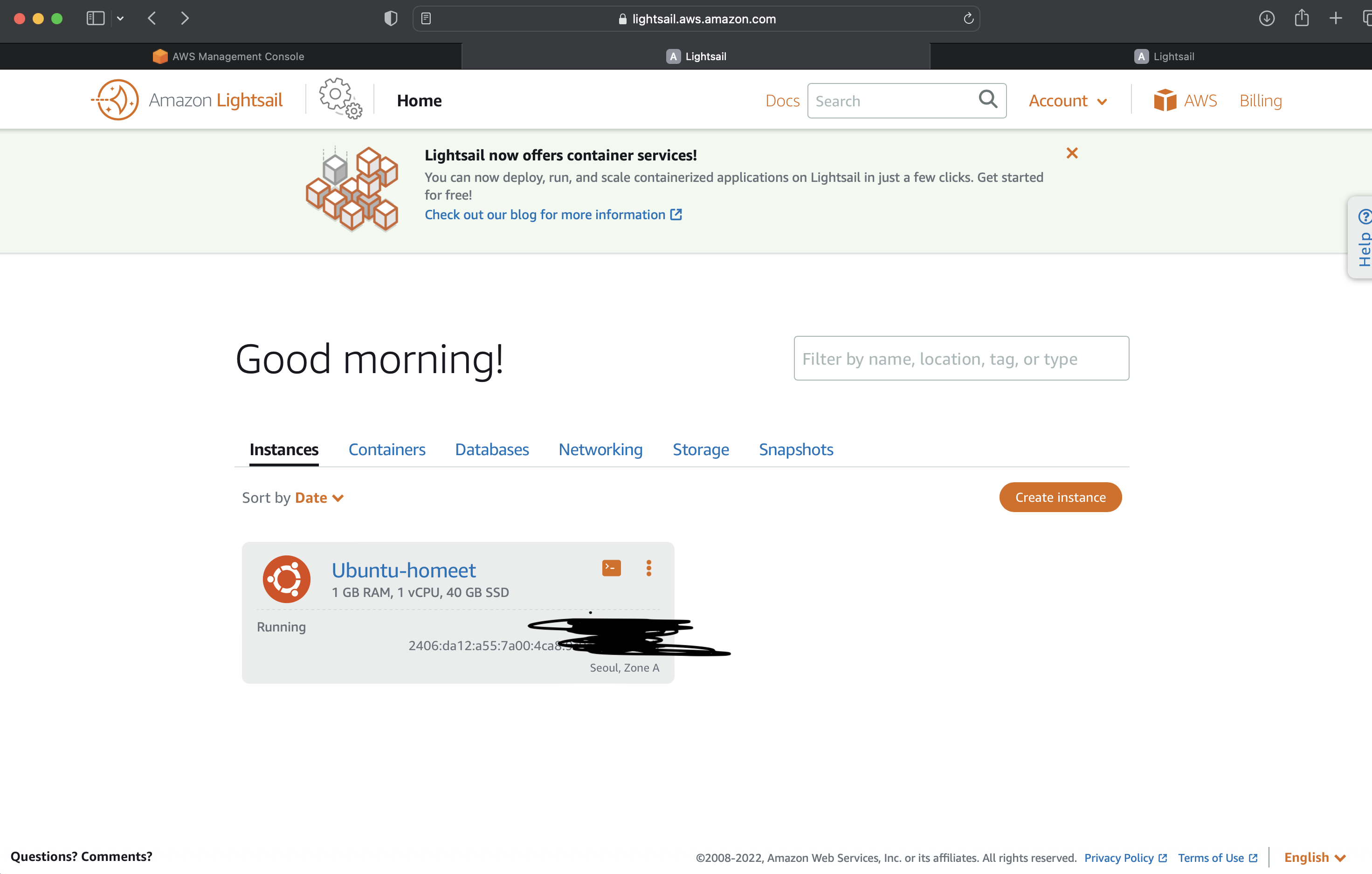 기존의 ec2만 써봤는데 Lightsail관련 세션을 몇번 듣고 호기심이 생겨서 이번 기회에 써봤는데 설정? 같은 부분들이 되게 편하다고 느꼈던 것 같아요 (클릭만 몇번 하면 알아서 잘 만들어줘요!!)