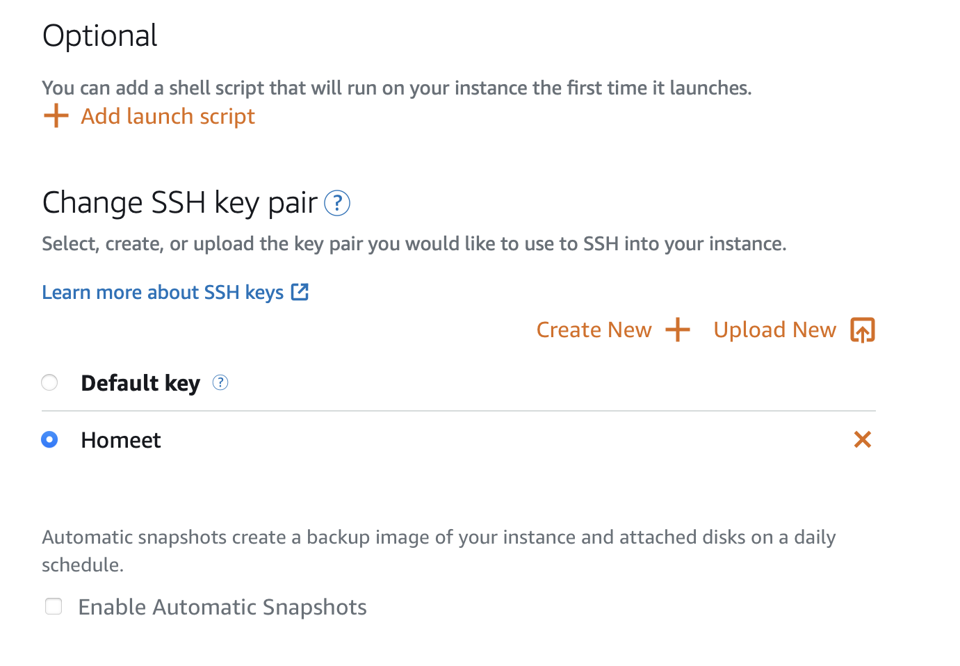 그 다음에는 이제 optional로 launch script 같은 것도 등록할 수 있는데 저는 딱히 초기에 인스턴스가 만들어질때 설정할게 따로 없어서 넣진 않고 ssh 키만 하나 발급 받아서 따로 저의 컴퓨터에 저장했습니다! 만드는 방법은 진짜 create new로 해서 만들기만 하면 돼서 설명할게 없네요,,