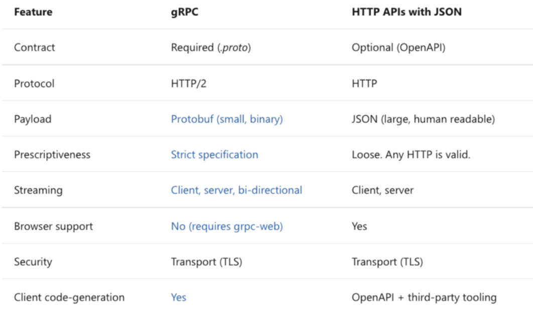 - gRPC : 호출하고 받아오는 규칙(contract)이 strict하다. 프로그래밍 언어의 일환이라 규칙 꼭 지켜야 한다. 그리고 브라우저에서 지원이 안됨.(grpc-web이라는걸 써야함.)