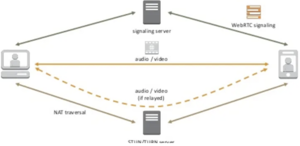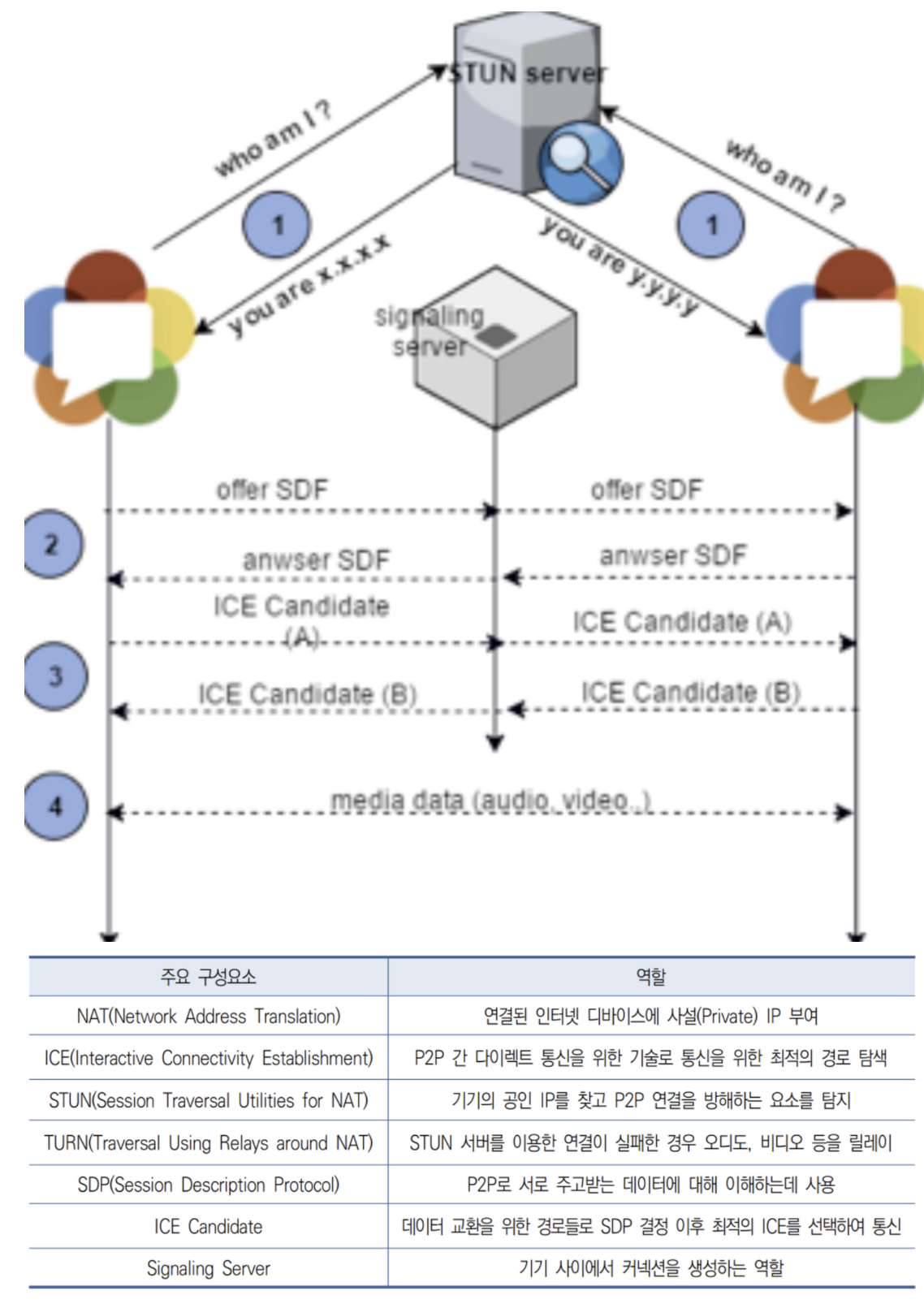ICE라는 이름으로 묶어서 왼쪽과 오른쪽이 통신을 하기 위해서 stun 서버에게 가서 각자의 아이피를 물어서 가져온 후 시그널링 서버에게 아이피를 알려주면 연결 설정하는 과정, 응답하는 과정을 마치면 미디어나 오디오를 p2p로 보냄.