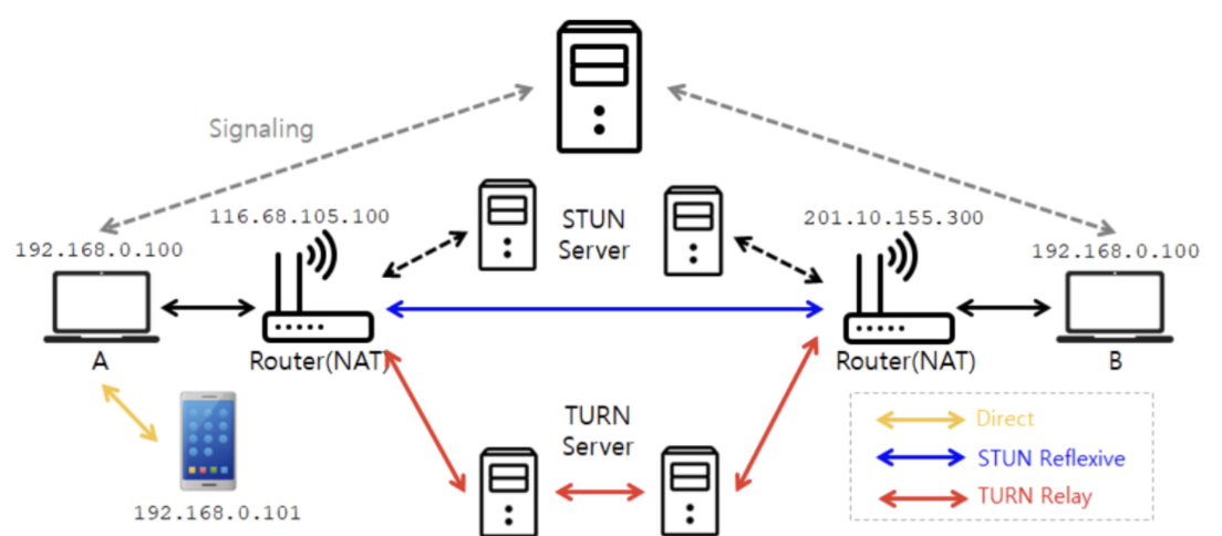 - 전체적으로 보자면 STUN서버를 통해 public ip를 얻어오고 TURN 서버를 통해 릴레이해서 NAT를 우회하여 최초로 등록을 하고 Signaling 서버로 연결 설정한 후 p2p방식으로 SDP를 보냄. (TURN 서버는 안쓸 수 도 있음.)