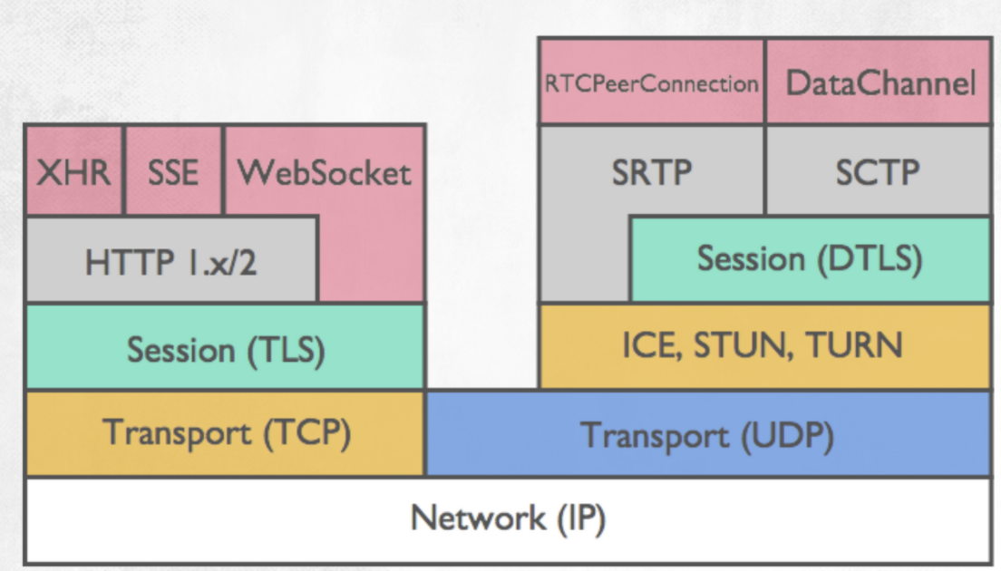 ip위에 tcp,udp 혼용해서 사용. udp 위에서 연결 설정하고 SDP를 주고 받는게 이 ICE에 대한 부분.. p2p 연결하는 api위에 올라가 있고 데이터 주고받는 datachannel위에 있음. 신뢰성 있는 데이터를 주고 받을려고 하면 tcp를 타고 websocket으로. websocket은 웹브라우저 위에서 소켓 통신할려고 만들어진 기술.