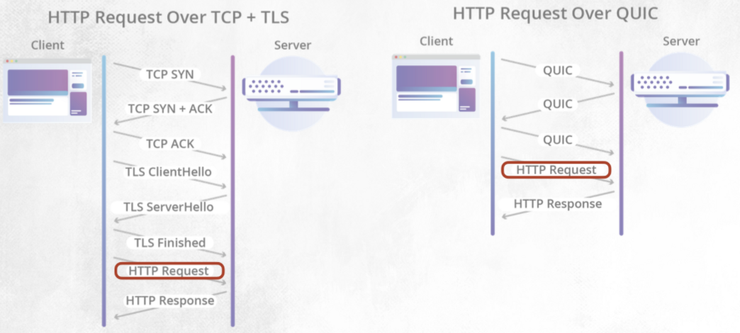 QUIC은 0-RTT, 1-RTT(round trip time - 내가 보내고 다시 응답을 받는 시간, 1같은 경우는 내가 보냈으면 하나를 받아야한다는 의미.) handshake를 제공 → 새로운 연결을 협상하고 설정하는데 걸리는 시간을 줄여줌.