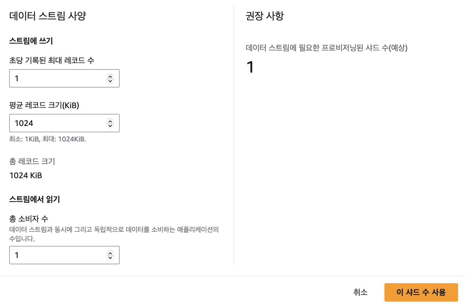 샤드 계산기를 누르면 아래처럼 초당 최대 레코드 수나 레코드 크기를 지정할 수 있어요! 여기서 소비자는 수는 consumer를 얘기하는겁니다!