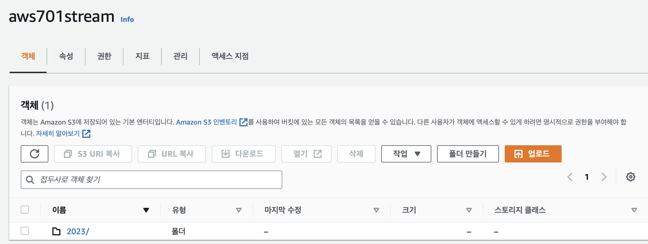 아래처럼 s3에 스트림 데이터가 온걸 확인할 수 있습니다!(추가적으로 퍼블릭 액세스 차단을 풀어주는게 필요해요 아마 ACL 관련 차단만 풀어주면 될거에요!)
