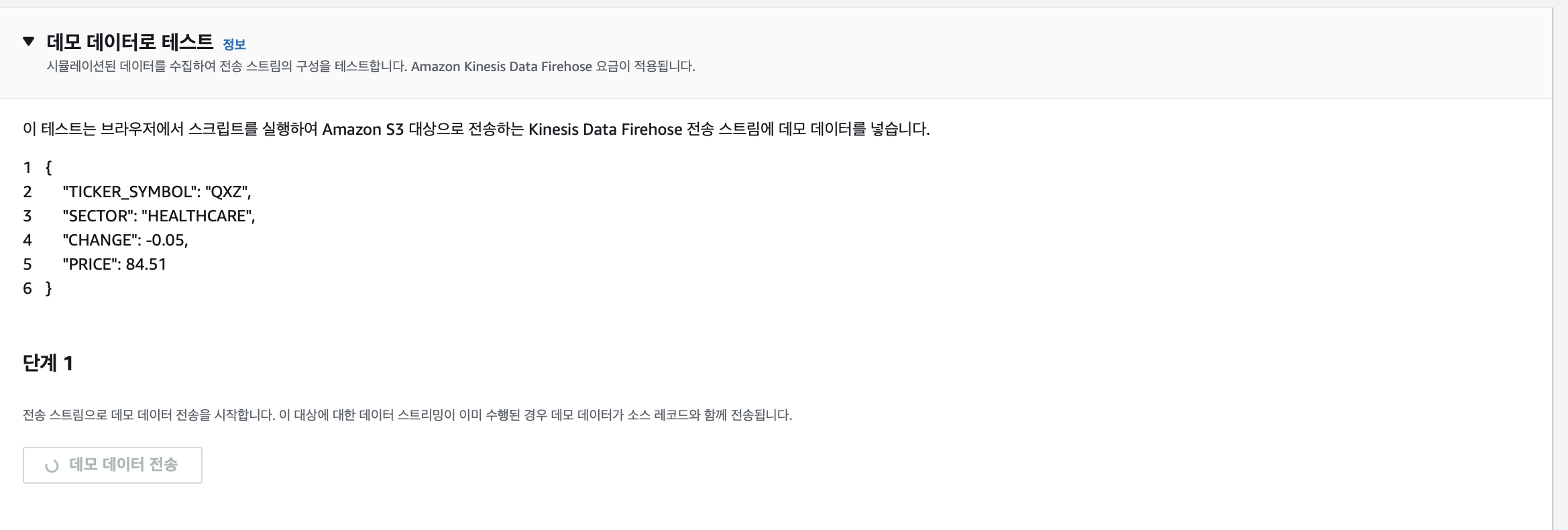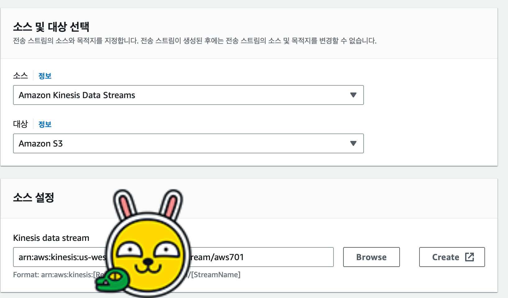 그 다음 Data Firehose 콘솔을 열어서 전송 스트림을 생성하면 되고 내가 만든 stream을 등록해주면 돼요