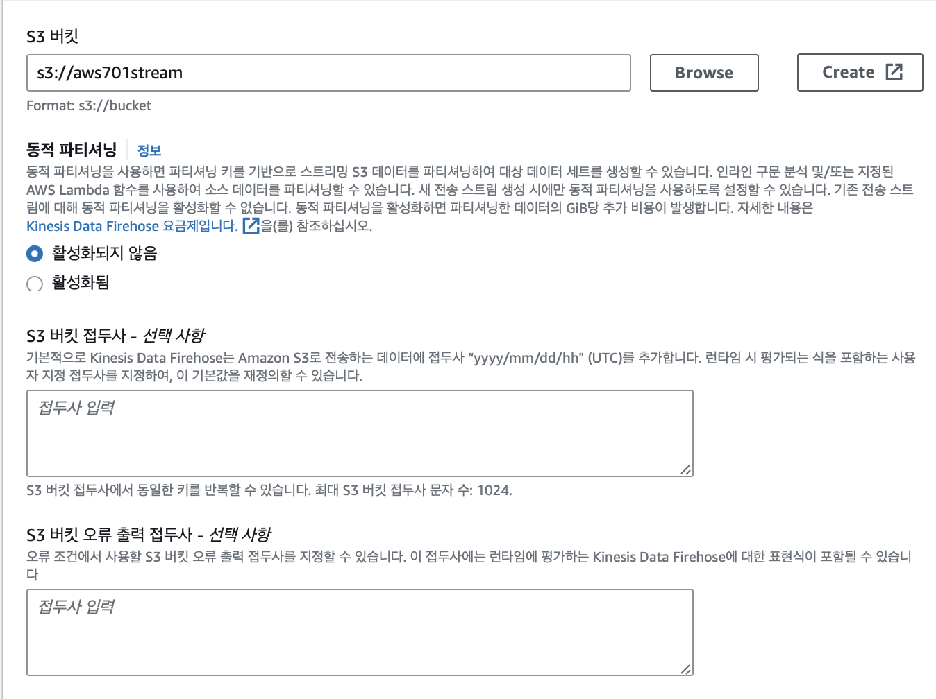 이제 만들어놨던 s3 버킷을 입력하고 동적 파티셔닝의 경우엔 default된 값을 그냥 썼고 접두사도 딱히 필요가 없을것 같아서 사용하지 않았어요!