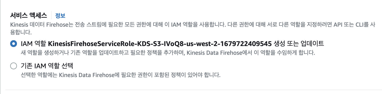 고급 설정에서 만들어놓은 IAM을 쓰거나 새로 생성해서 쓰면 돼요(Kinesis가 스트림 및 S3 버킷에 액세스할 수 있는 정책이 필요)