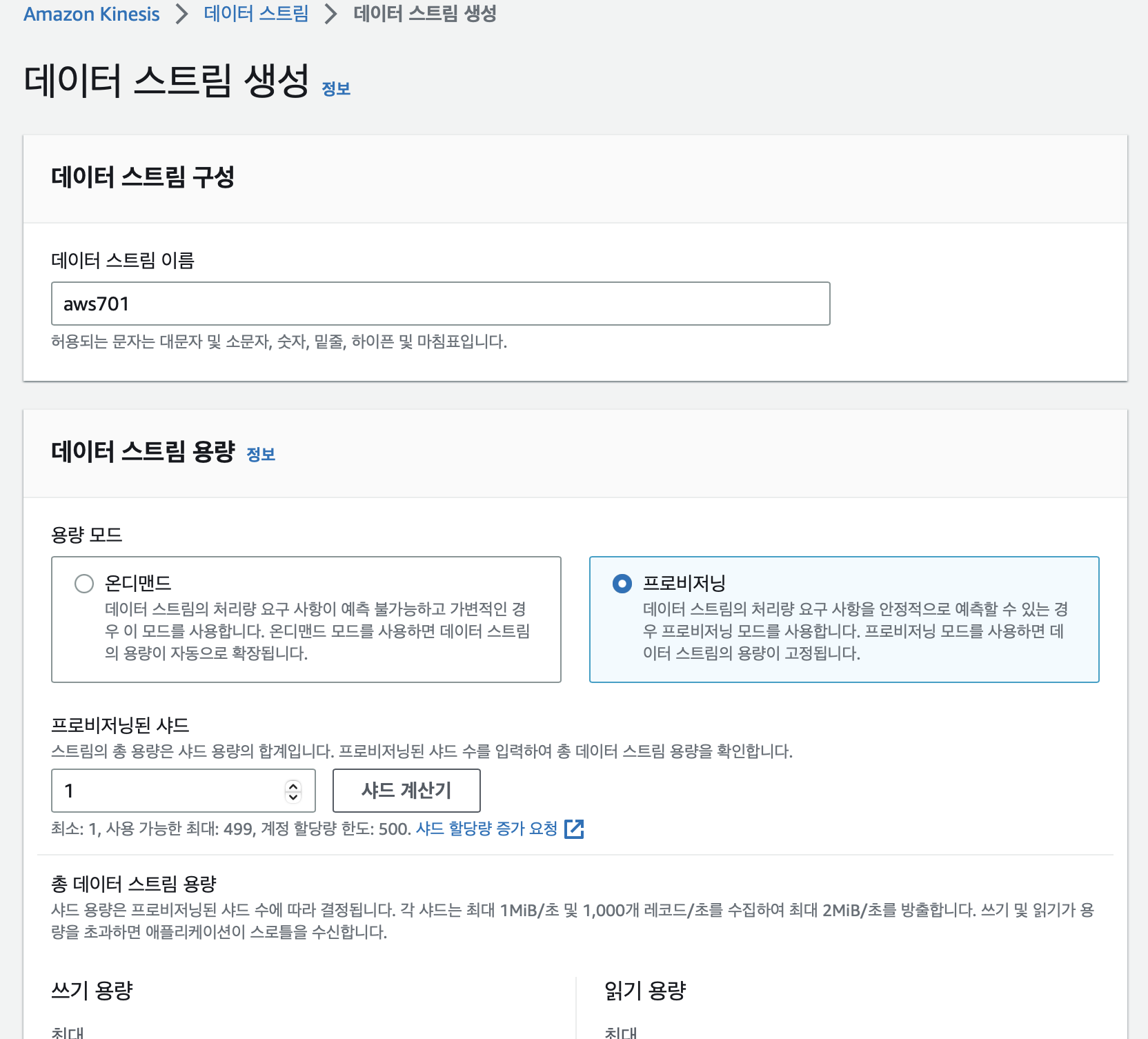온디맨드 같은 경우에는 써있는 것처럼 자동으로 확정되다 보니 과금될 우려도 있고 저는 단순 실습이라 프로비저닝으로 샤드는 한개를 만들어서 실습을 진행했어요. 샤드는 스트림에서 고유하게 식별되는 데이터 레코드 시퀀스이고 스트림은 보통 하나 이상의 샤드로 구성되어 있어요. 갹 샤드는 고정된 용량 단위를 제공해 주며 읽기에 대해 초당 최대 5개의 트랜잭션, 초당 최대 2MB의 데이터 읽기 속동, 초당 최대 1000개의 레코드까지 그리고 초당 최대 1MB의 총 데이터 쓰기 속도를 지원한다고 합니다!