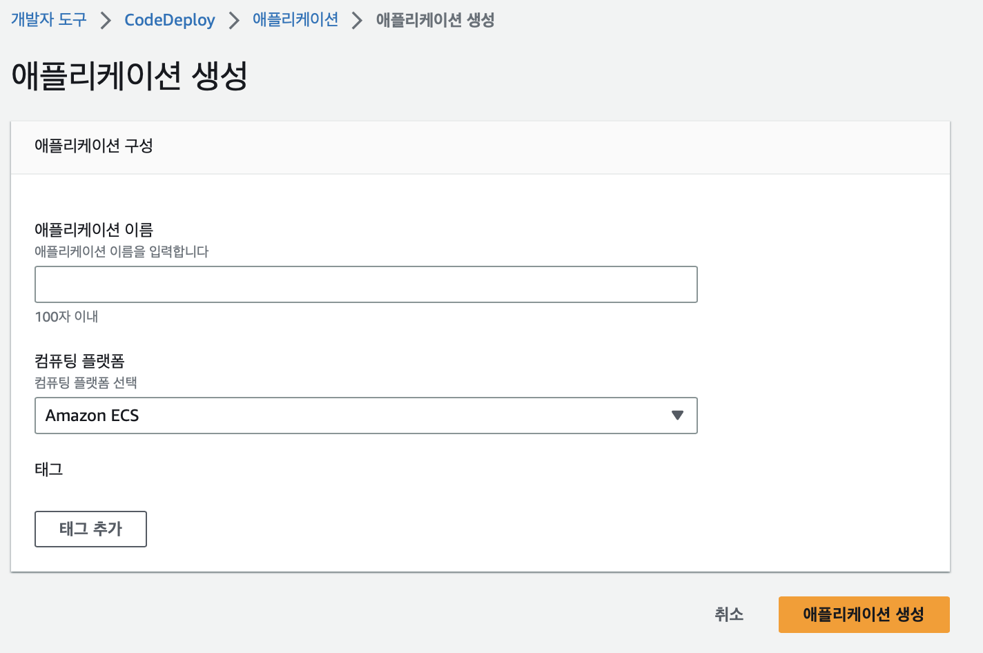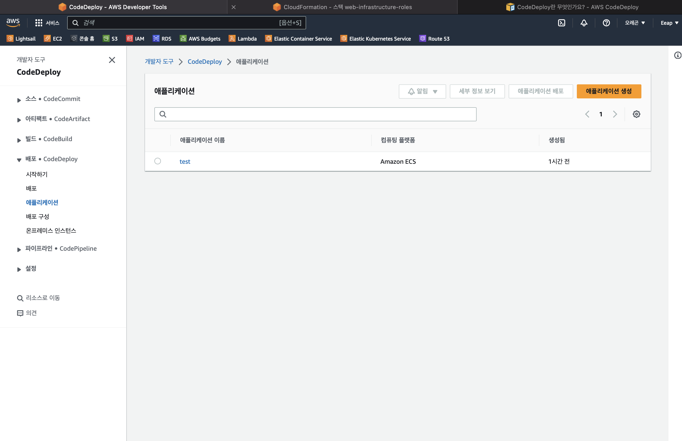 먼저 애플리케이션을 생성해주는데 저는 ECS서비스를 이용해서 배포할 예정이라서 플랫폼을 ECS로 선택했어요.