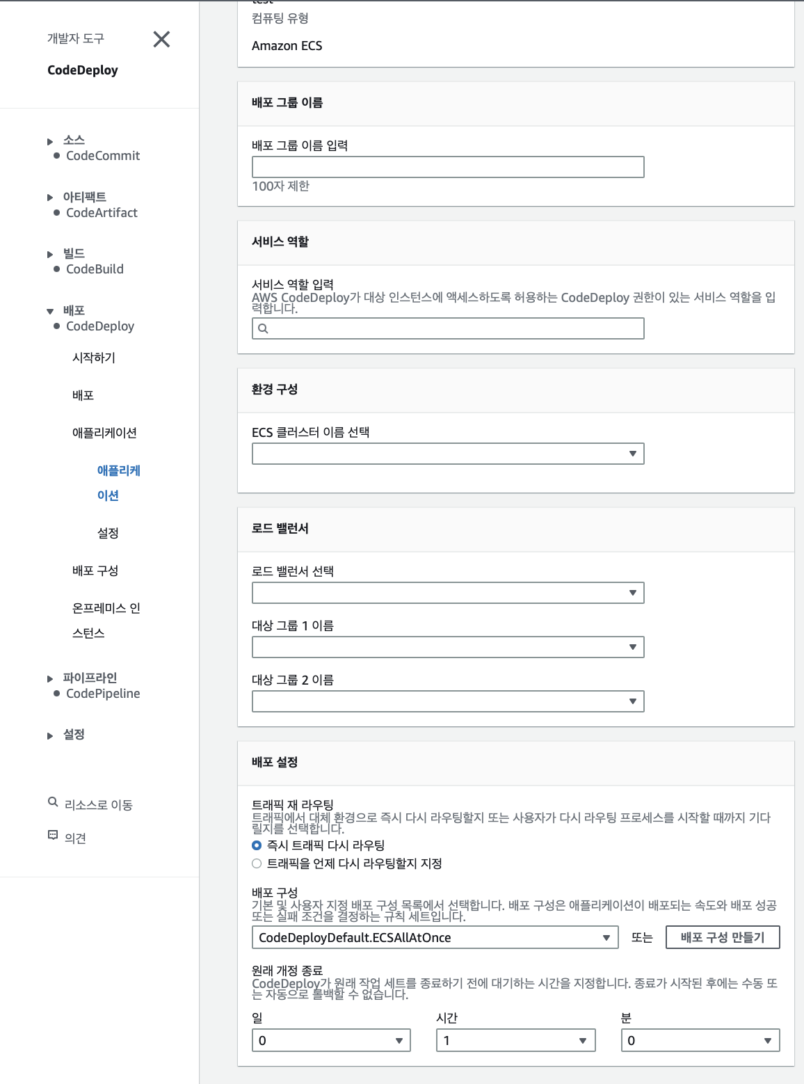 그 다음 해당 애플리케이션에 들어가서 CodeDeploy가 해당 서비스에 접할 수 있는 역할을 선택해줍니다(역할 정책엔 CodeDeployRoleForECS 필요) 그다음 로드밸런서의 대상그룹의 경우 blue green의 그룹을 선택해주면 돼요!