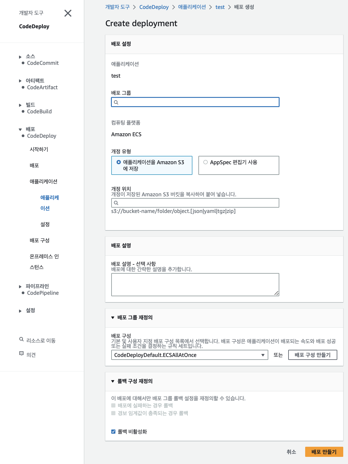 그 다음 배포를 만들면 돼요! 물론 콘솔창으로도 쉽게 할 수 있지만 cli로도 관리할 수 있어서 만약 cli를 사용할 경우에는 aws cli에 대한 설치 해서 사용하면 돼요!