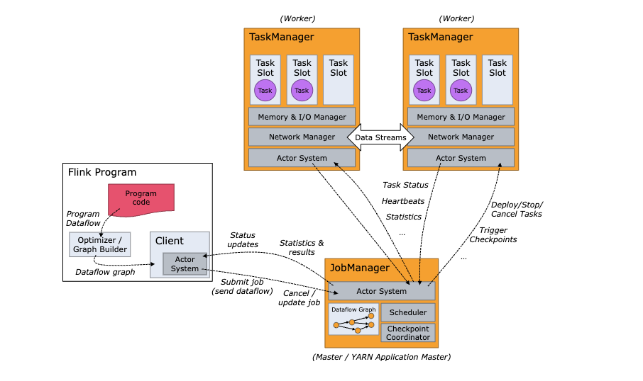 먼저 Flink의 실제 구조에 대해 한번 알아보겠습니다. Flink는 크게 JobManager와 TaskManager로 구분할 수 있습니다! 두 요소는 standalone cluster나 컨테이너, YARN 엔진 등에서 사용할 수 있습니다.