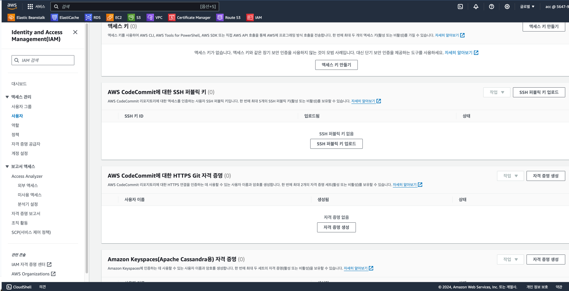 여기선 간단한 방법으로 Git 자격증명을 다운받아서 진행을 해보도록 하겠다. 해당 자격 증명 생성을 누르면 가이드가 뜨게 되고 가이드에 따라서 IAM user 페이지로 이동하면 된다.