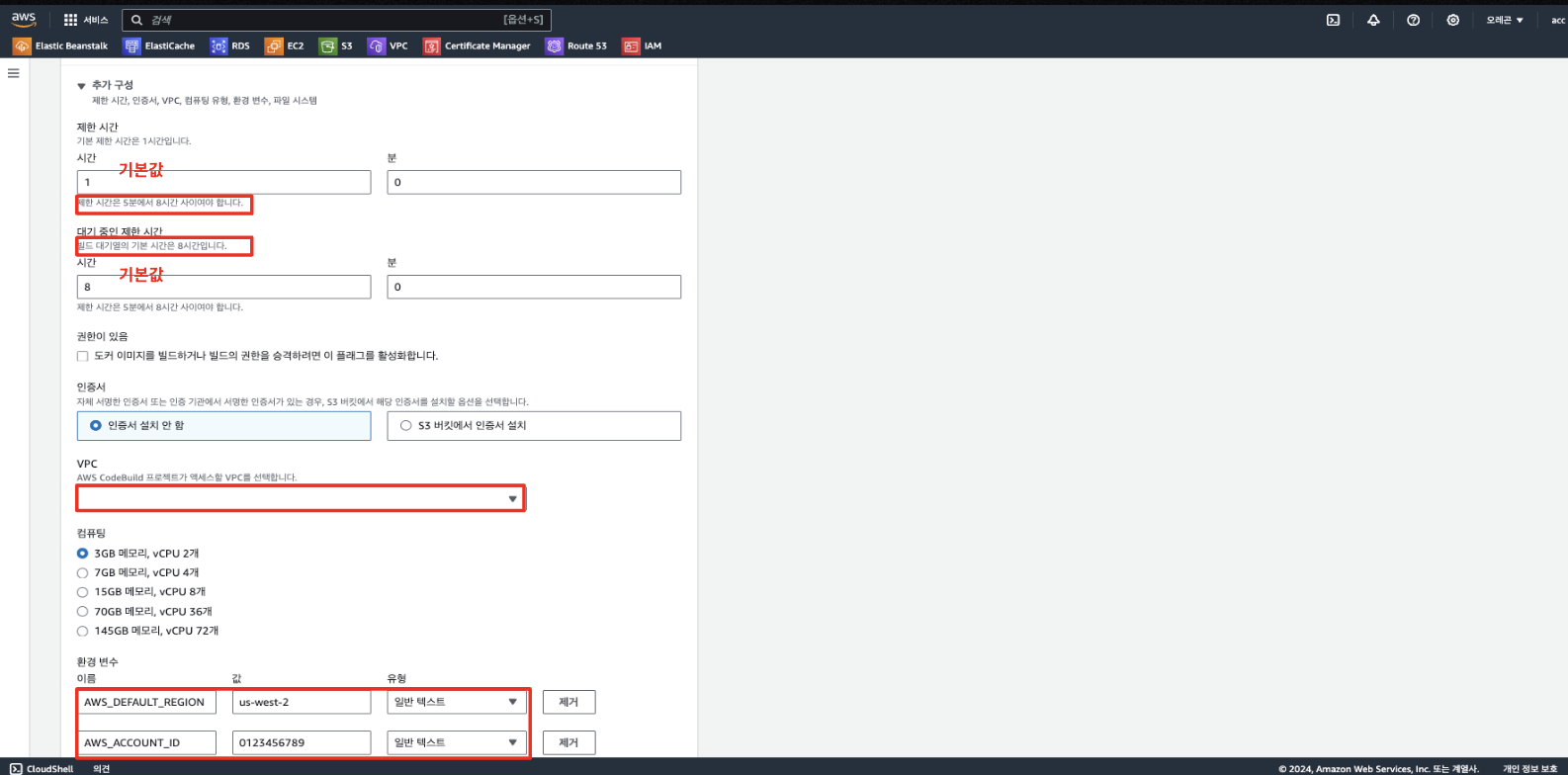 추가로 구성할 수 있는 파라미터로는 제한 시간, 인증서, vpc 설정, 컴퓨팅 환경 등이 있다. 앞서 언급했듯이 build 및 test 단계에서 RDS와 같은 vpc 내부 서비스에 접근할 필요가 있다면 vpc를 선택해주면 된다. 또한, build 환경에 대한 환경 변수를 노출할 수도 있는데 여기선 region 정보나 aws account id 정보를 일반 텍스트로 넘겨주었고 이외에도 parameter store나 secrets manager를 활용할 수 있다.