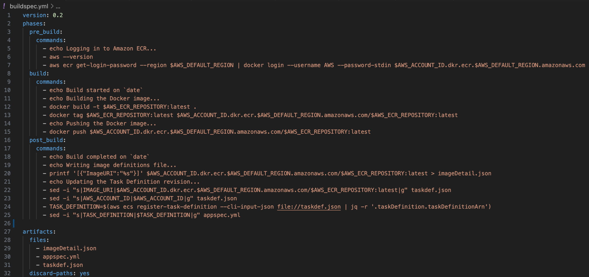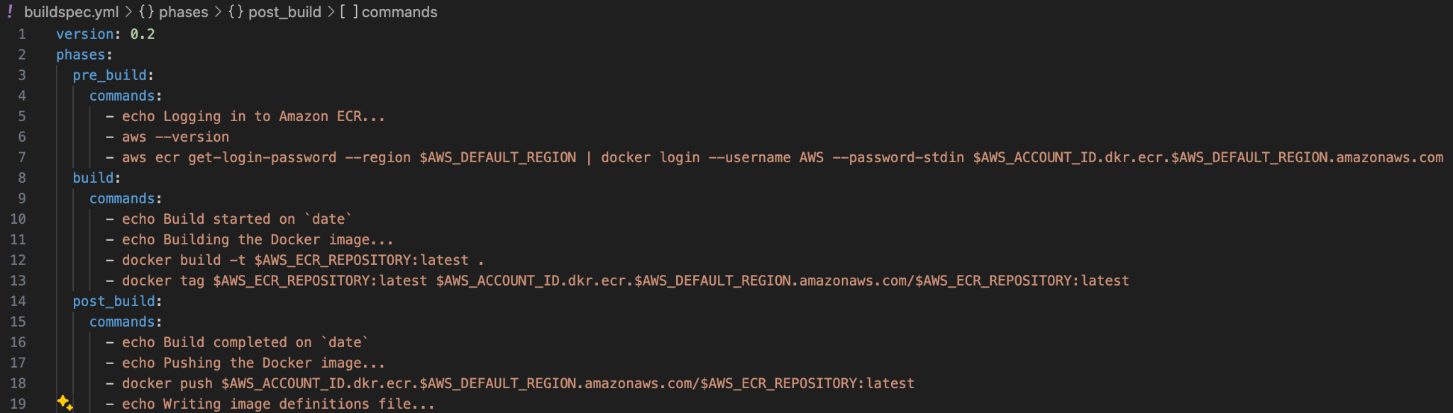 CodeBuild에서는 build 단계에서 어떤 작업을 수행할지에 대한 명세인 스크립트 파일도 필요하다. 스크립트 파일을 build 프로젝트를 구성할 때 커맨드를 하나씩 입력해서 구성할 수도 있고 따로 buildspec.yml을 만들어서 source의 최상단 디렉토리에 위치시켜 build 시에 참조할 수도 있도록 할 수 있다. 추가적으로 build 환경에 대한 환경 변수를 설정할 수도 있는데 build 프로젝트를 구성할 때 환경 변수를 입력하거나 buildspec.yml에 env로 설정할 수도 있다.
