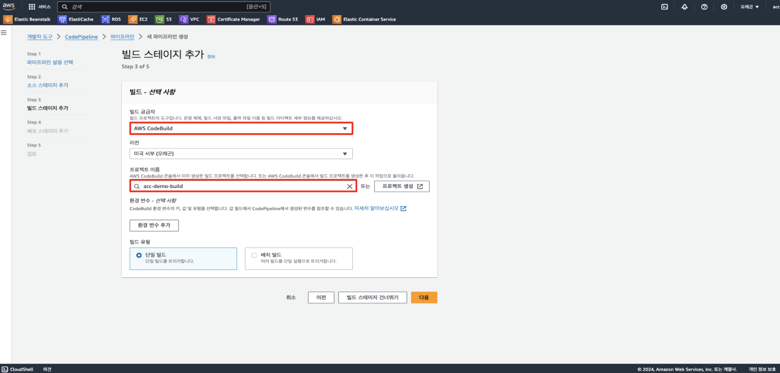 빌드 공급자로는 이전에 만든 AWS CodeBuild 프로젝트를 설정해주었고 환경 변수는 이전에 등록을 했기 때문에 추가하지 않고 넘어가면 될 것 같다.