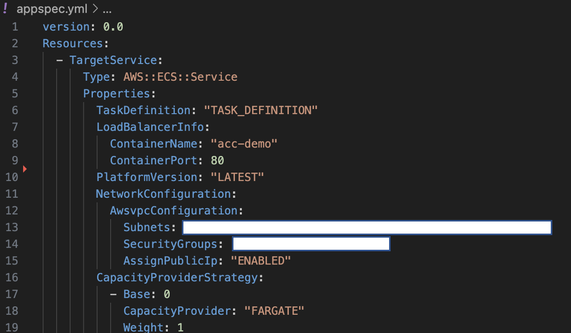 위는 CodeDeploy에 쓰이는 appspec.yml 파일이다. target service는 ECS로 하였고 taskdefinition에 개정된 task definition을 반영할 수 있도록 하였다. 이 이외에 다른 내용은 기본적인 vpc subnet 설정이나 컨테이너 이름이나 포트 정보 등을 담았다.