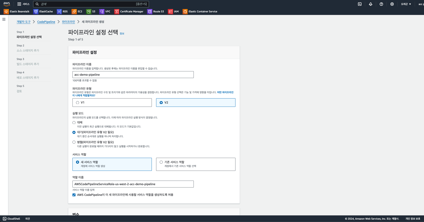 파이프라인 유형은 queue형태로 순서대로 배포하는 대기 모드를 선택해서 진행하였으며 CodePipeline에 대한 새로운 서비스 역할을 생성하도록 구성하였다. (기존에 있다면 기존 서비스 역할 활용)