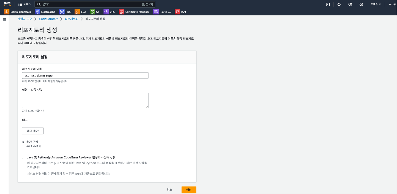 먼저 AWS CodeCommit 서비스를 이용해서 하나의 리포지토리를 생성하였다. CodePipeline의 source로 사실 github을 써도 상관은 없지만 AWS Code Series를 이용해보기 위해 전부 다 aws 서비스를 활용하였다.