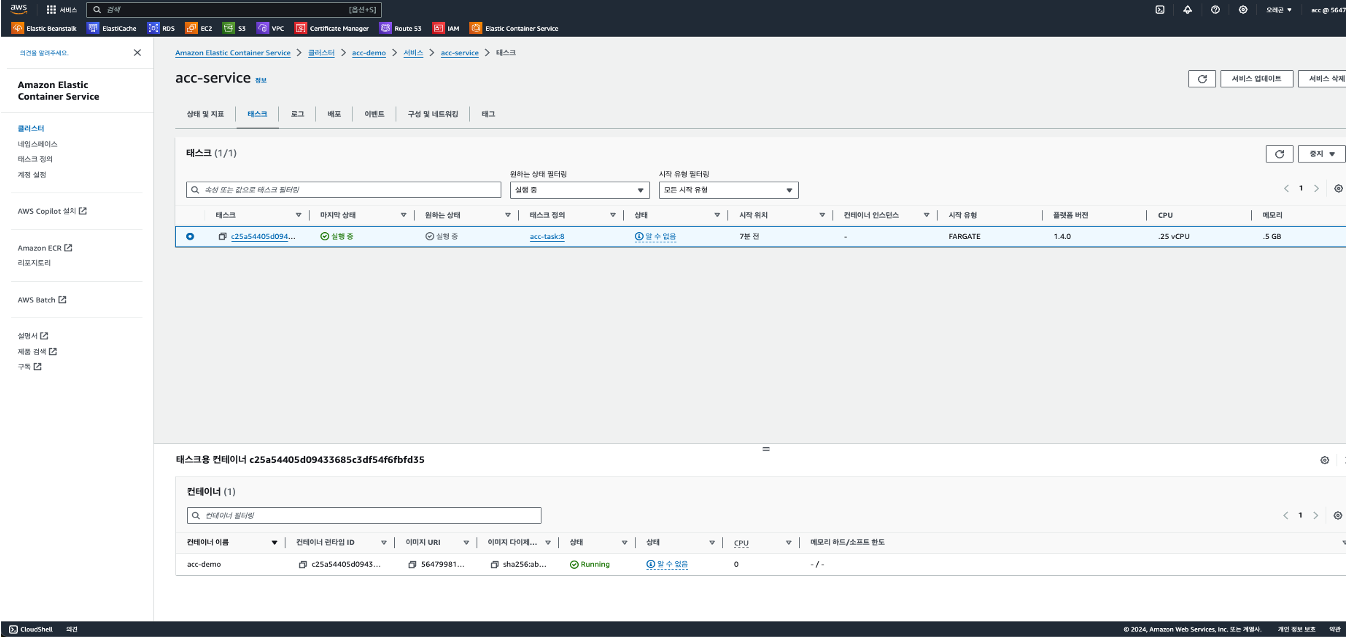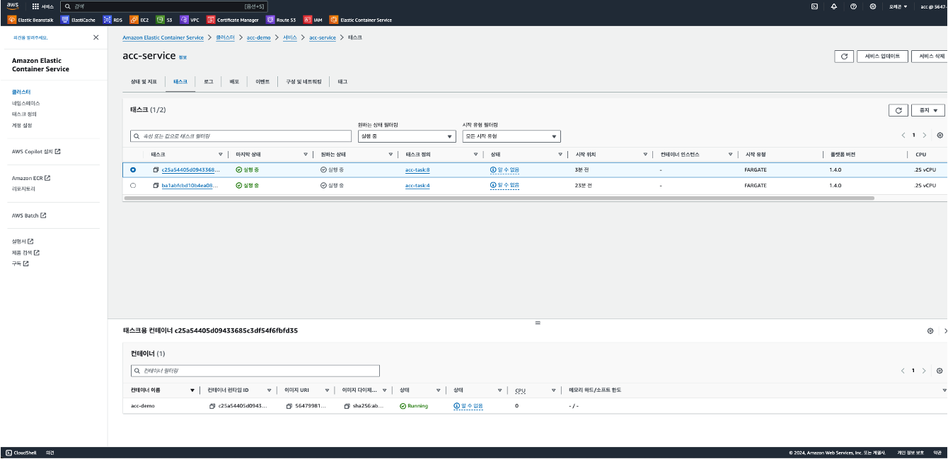 위에서 살펴본 것처럼 코드를 변경해서 main branch에 반영하면 CodePipeline이 동작하게 되고 각 스테이지가 queue 형태로 동작하게 된다. 배포 단계에서는 설정한 종료 시간 전까지 ECS의 Service에는 기존 Task와 새로운 Task가 존재하고 있고 종료 후에는 기존 Task가 사라지게 된다.