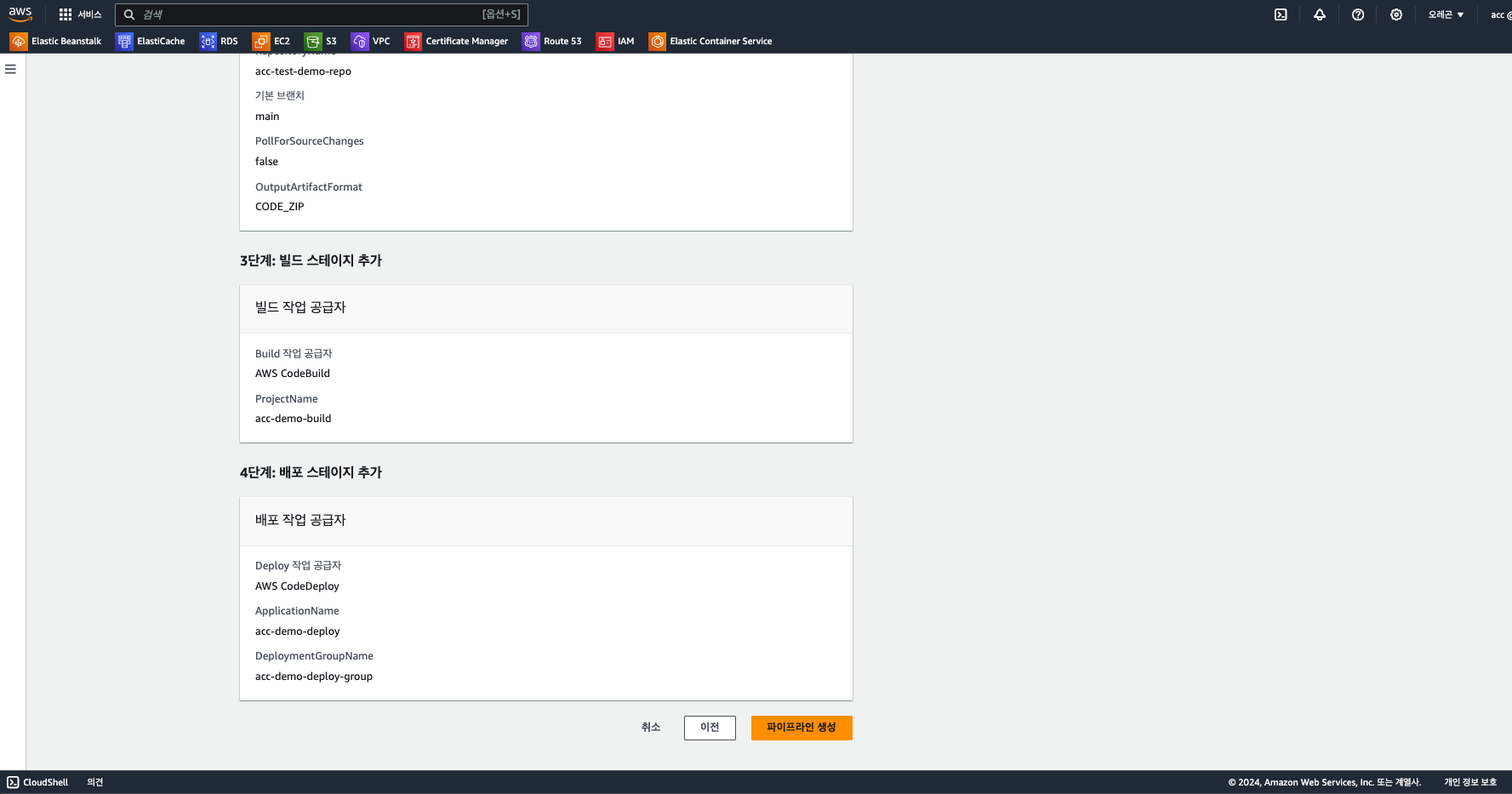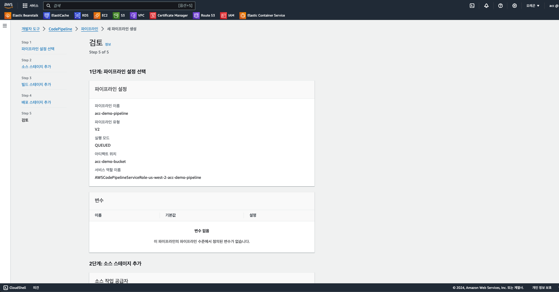 검토 후 이상이 없다면 파이프라인 생성을 클릭해서 생성해주면 되고 이후에도 파이프라인의 각 스테이지를 편집해서 수정할 수 있다.