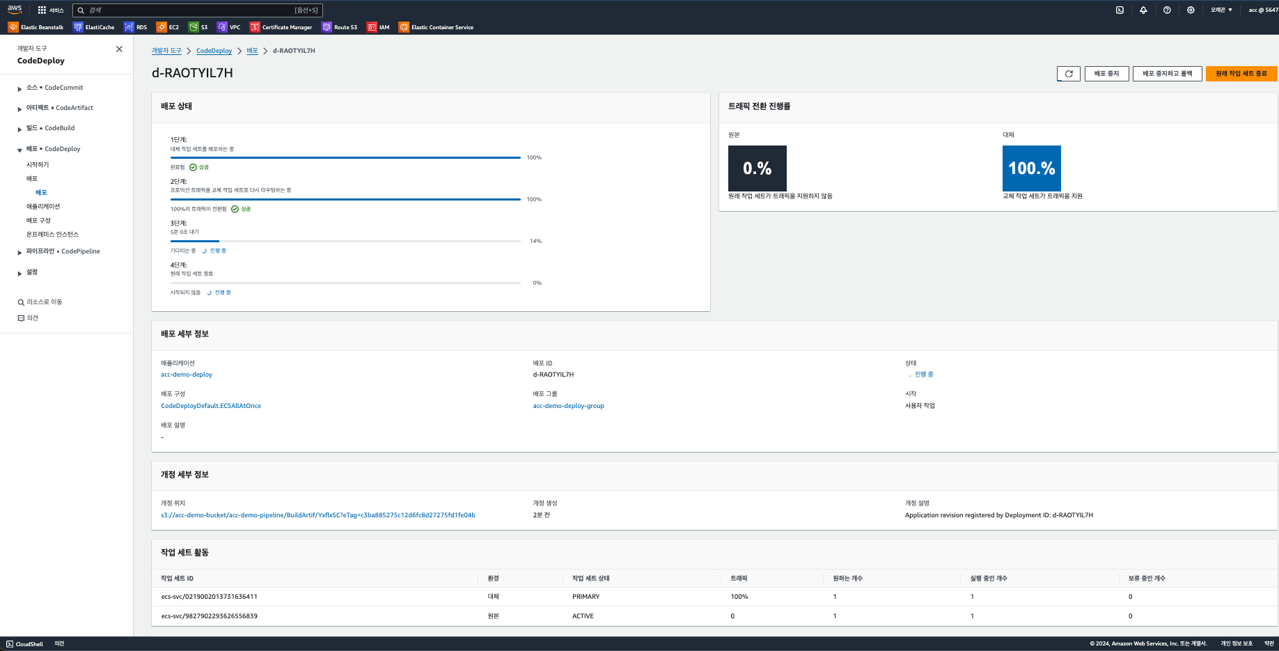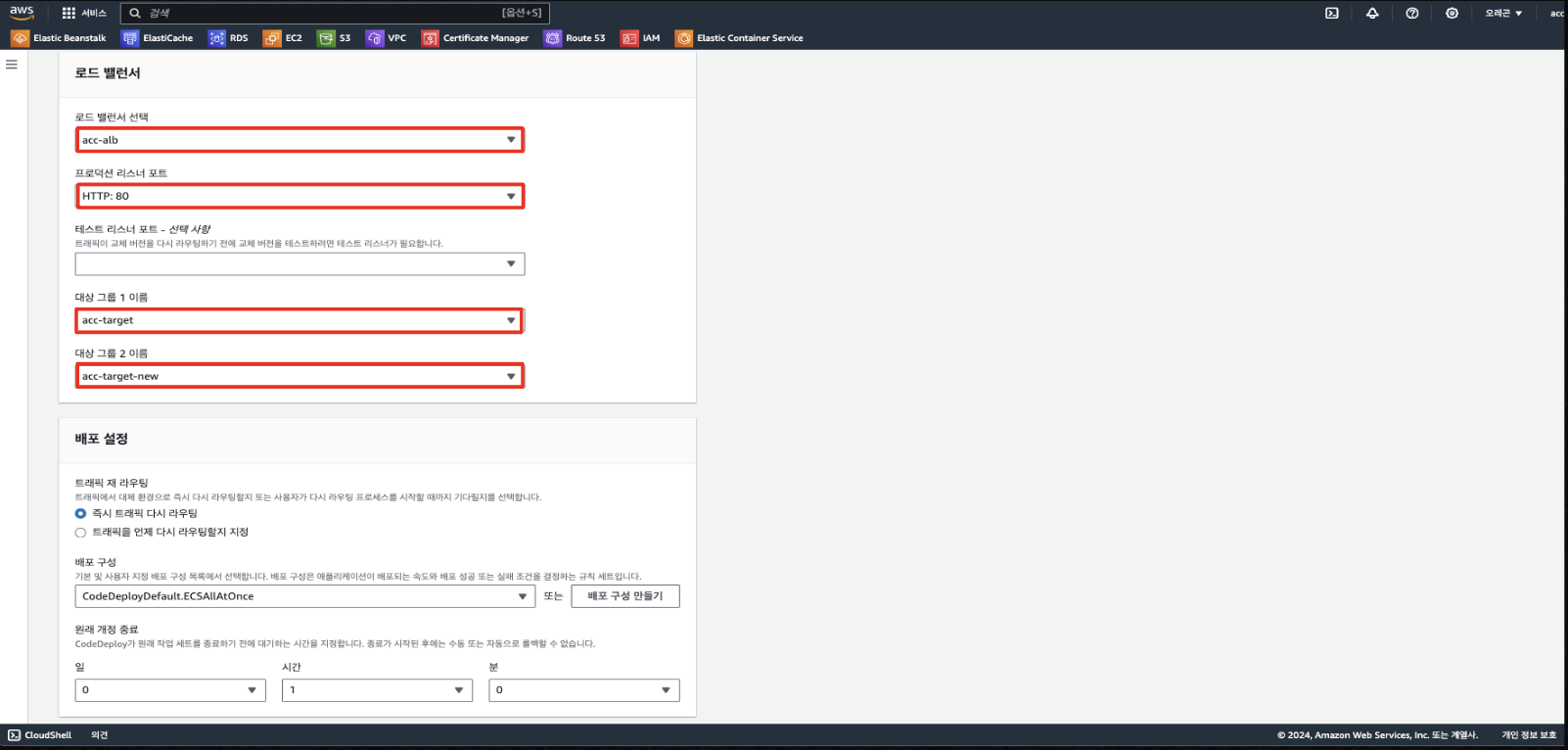 배포 설정의 경우 기본으로 되어있는 즉시 트래픽을 다시 라우팅으로 설정하고 배포 구성의 경우 한번에 전부 라우팅하는 것으로 설정했다. 그리고 기존 개정 종료는 기존 작업 세트를 종료하기 전에 대기하는 시간이며 종료가 시작된 후에는 수동 또는 자동으로 롤백할 수 없기 때문에 적절한 시간을 선택하여 새로운 배포에 문제가 생겼을 경우 바로 롤백할 수 있도록 구성해야 한다.