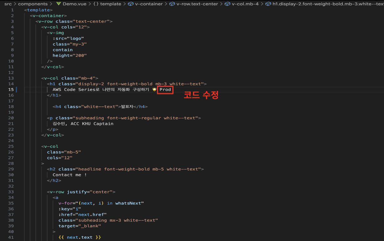 이제 자동으로 새로운 이미지를 빌드하고 ECS에서 서비스를 할 수 있도록 CICD 자동화 워크플로우를 구성하였다. 이제 실제로 잘 동작하는지 확인하기 위해 위처럼 코드를 바꾸고 git push를 진행하여 AWS CodePipeline의 대시보드를 관찰하였다.