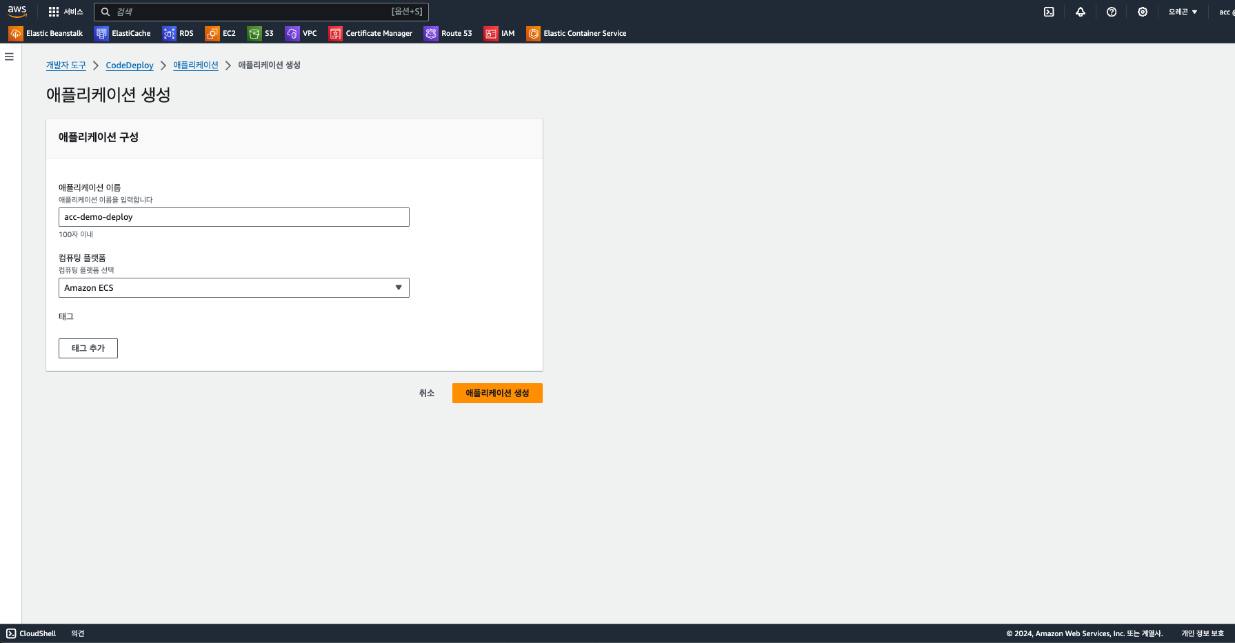 다음으로 AWS CodeDeploy 설정이다. CodeDeploy 애플리케이션 생성하는 방법은 되게 간단하게 애플리케이션 이름과 컴퓨팅 플랫폼만 선택해주면 된다.