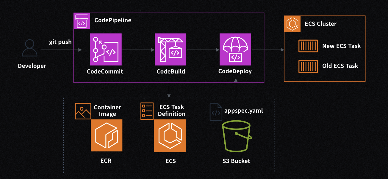 앞서 살펴봤던 AWS Code Series 중 AWS CodeCommit, AWS CodeBuild, AWS CodeDeploy, AWS CodePipeline을 이용해서 Amazon ECS에 새로운 컨테이너를 자동으로 배포하는 CI/CD 워크플로우에 대한 데모 아키텍처를 구성해보았다.