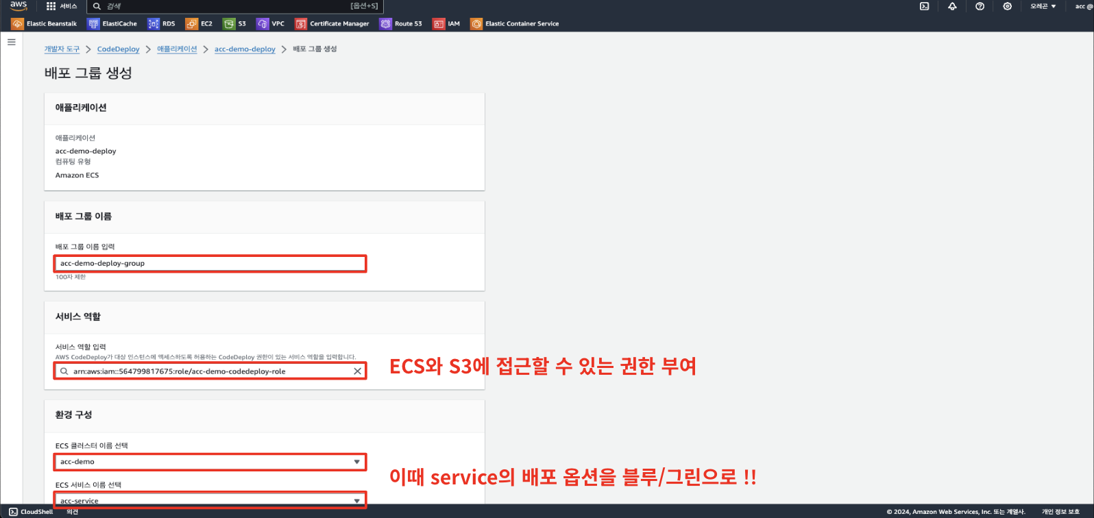 애플리케이션을 구성했다면 이젠 해당 배포 그룹을 생성해줘야 한다. 배포 그룹의 서비스 역할은 ECS에 배포하고 S3에서 빌드 이후에 전달될 아티팩트에 접근하기 위해 ECS와 S3에 접근할 수 있는 권한을 부여해주어야 한다.