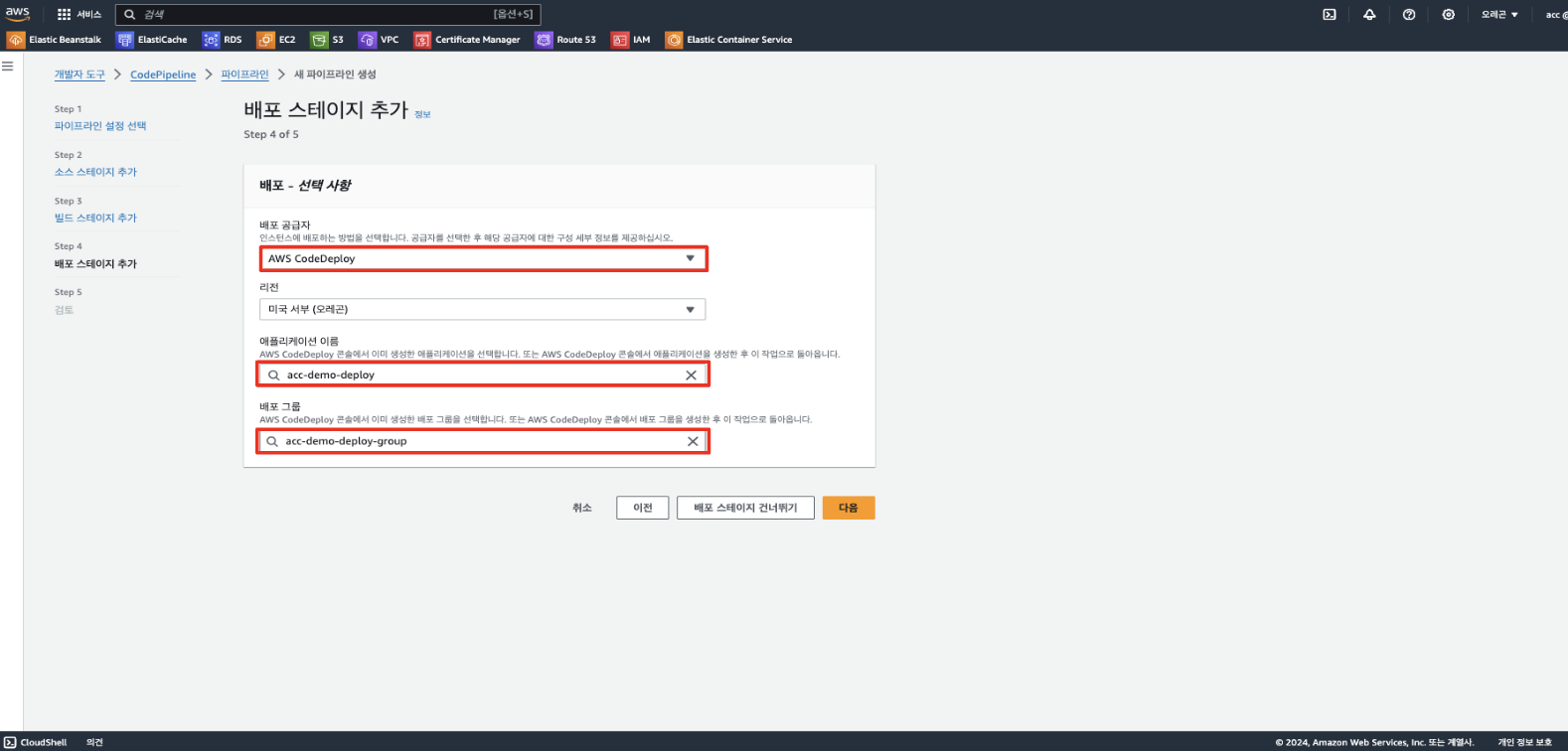 배포 공급자로는 이전에 만들었던 CodeDeploy를 사용하였고 이외에도 ECS나 Elastic Beanstalk 등을 설정할 수도 있다. 또한, 각 스테이지마다 건너뛰기 옵션이 있는데 건너뛰기를 해도 이후에 pipeline 대시보드 각 스테이지에서 추가해주거나 그냥 스킵할 수도 있다.