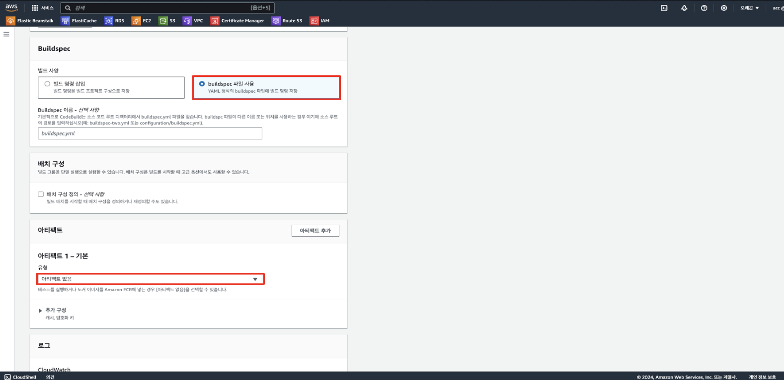 빌드 사양의 경우 명령을 하나씩 삽입하지 않고 리포지토리 최상단 디렉토리인 root에 buildspec.yml을 정의해서 사용할 예정이기 때문에 파일 사용을 선택하였다. 그리고 도커 이미지를 ECR에 넣을 예정이기 때문에 아티팩트는 없음을 선택하였다.