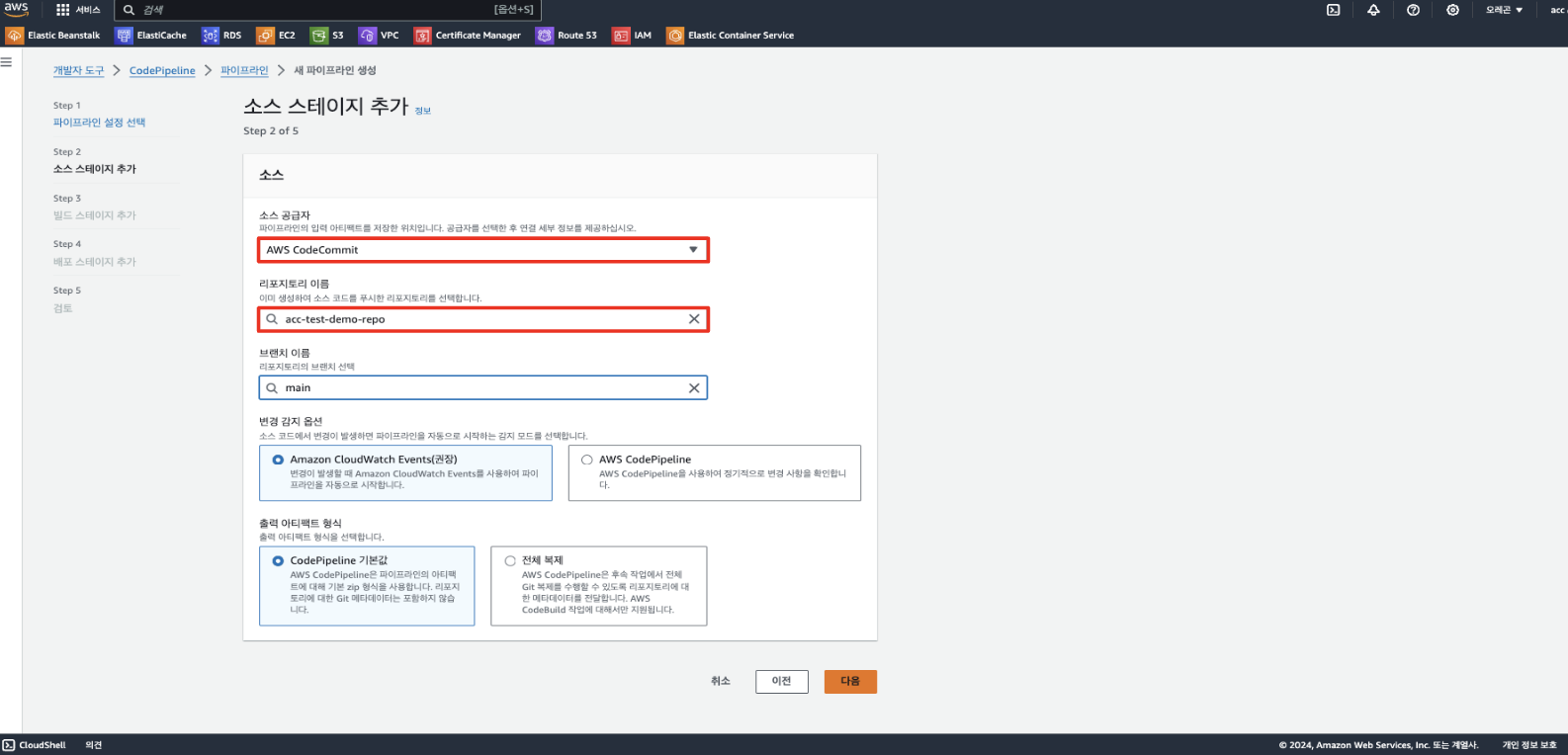 이제 배포를 위한 모든 서비스를 구성하였기 때문에 이를 하나의 워크플로우로 자동화할 수 있도록 AWS CodePipeline을 이용해서 구성하였다.