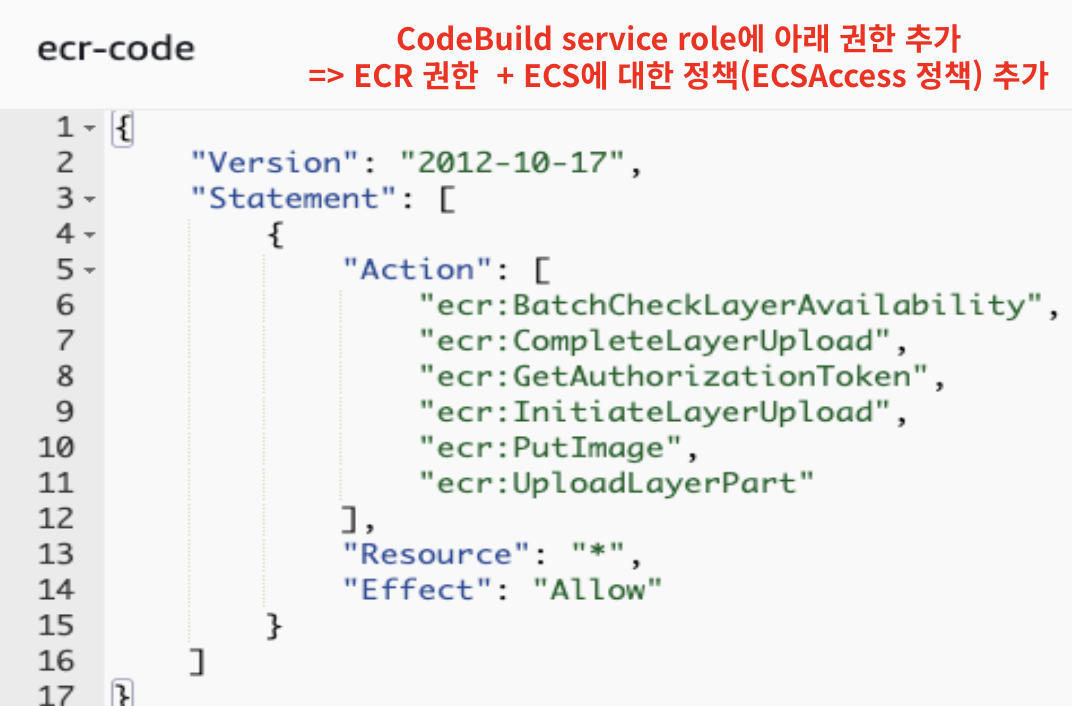 추가로 CodeBuild 서비스에 대한 권한을 조금 변경해야하는데 아래처럼 ECR과 관련된 권한을 추가하고 ECS 작업 정의를 수정하기 위해서 ECS에 대한 접근 정책을 추가해줘야 한다.