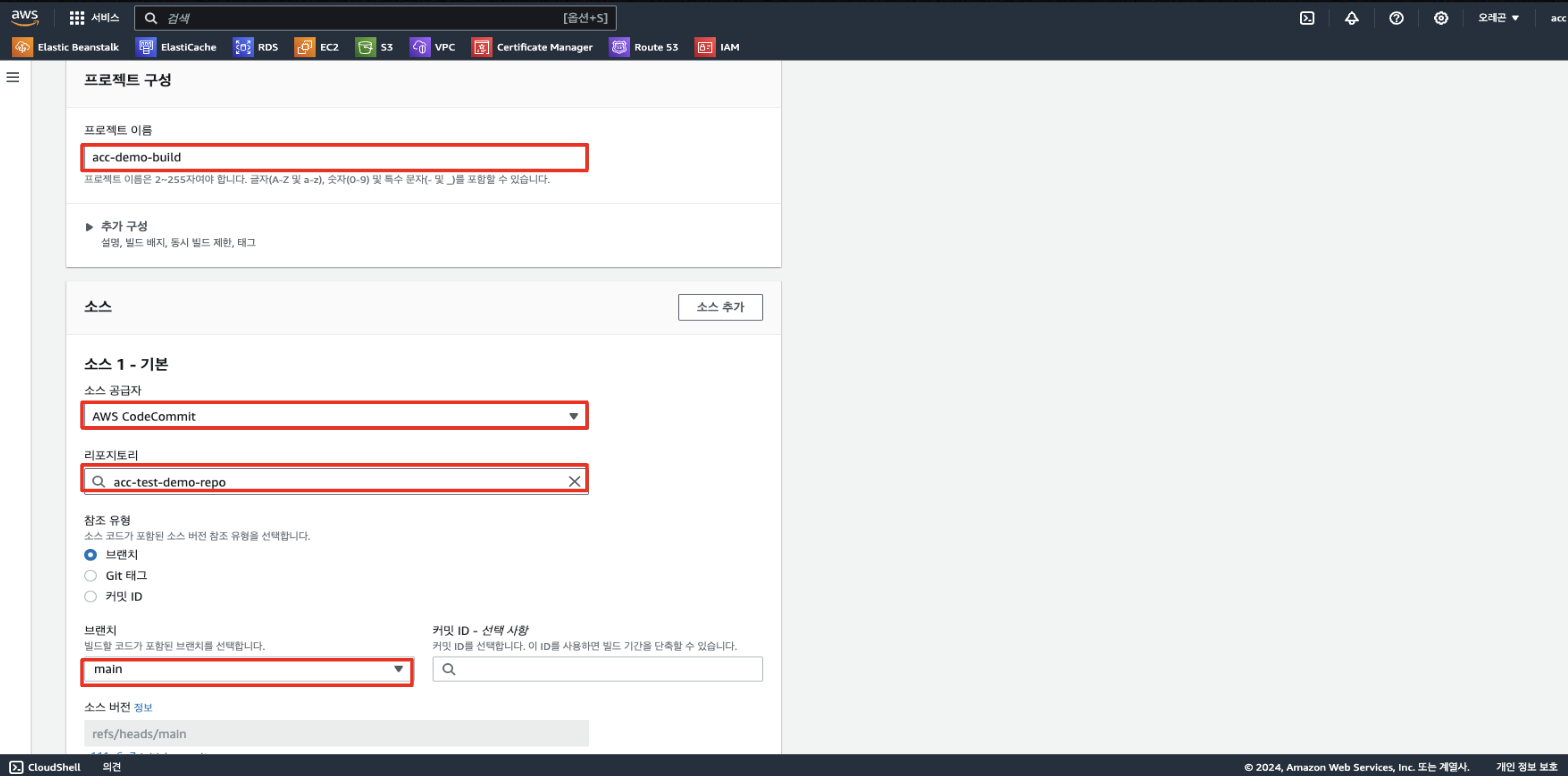 그 다음 AWS CodeBuild 프로젝트 구성 과정이다. 소스 공급자로 이전에 만든 CodeCommit을 선택하였고 여기서 github이나 gitlab 등을 선택할 수도 있다. branch 같은 경우는 main에 push가 있을 경우 build하기 위해서 main branch를 선택했다.