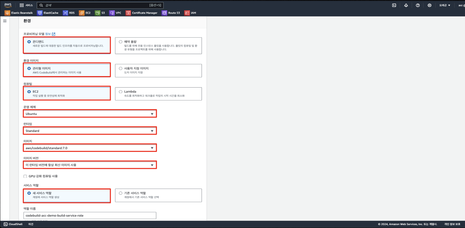 build 환경의 구성 이미지의 경우 관리형 이미지를 사용하였고 컴퓨팅 환경도 EC2의 ubuntu를 선택하였다. 사용자 지정 이미지의 경우 ECR이나 다른 외부 registry를 사용할 수도 있으며 컴퓨팅 환경을 lambda로 설정할 경우 런타임 환경을 언어에 맞게 수정할 수 있다. 하지만 lambda 클릭하면 나오는 안내문처럼 속도 최적화와 작업 시작 시간 최소화를 사용하다보니 예약 용량 같은 옵션 등을 사용할 순 없다. 즉, 필요에 맞게 선택해야한다. CodeBuild 서비스를 위한 역할은 기존에 없어서 새로 생성을 해주었다.