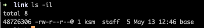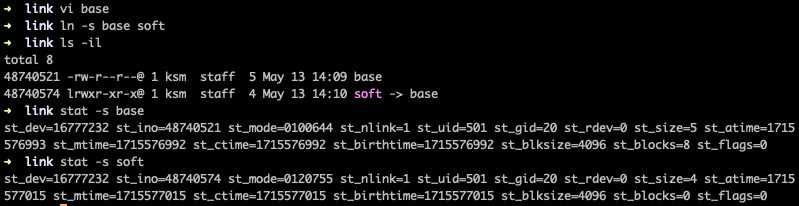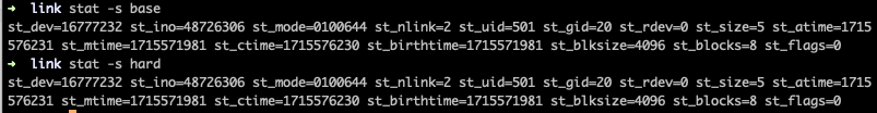 위의 그림과 같이 하드 링크와는 다르게 소프트 링크 파일은 다른 inode값과 timestamp, mode 값 등이 다르다는 것을 알 수 있다.(소프트 링크는 mode가 012로 시작하고 일반 파일은 010으로 시작하며 nlink는 하드 링크의 개수를 나타내기 때문에 하드 링크 때와 값이 다르다.)