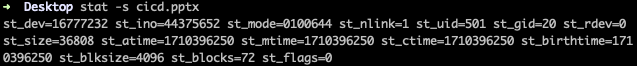 리눅스에서는 친절하게도 해당 파일에 대한 정보를 볼 수 있도록 `stat -s file_name`이라는 명령어가 있다. 간단하게 예전에 발표했던 자료의 파일 정보를 확인해보았다. 자세한 내용이 궁금하다면 `man stat`을 통해 해당 커맨드에 대한 정보를 살펴보거나 다음 링크를 참고하길 바란다.