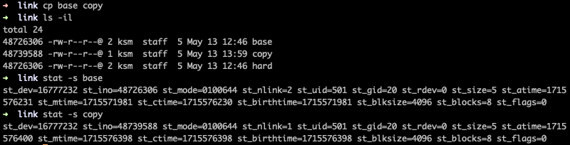 위처럼 copy는 하드 링크 방식과 다르게 inode 번호도 다르고 timestamp 값이랑 link의 개수도 다르다는 것을 알 수 있다. 즉, copy는 안에 들어있는 데이터만 복사를 하는 것 같다.
