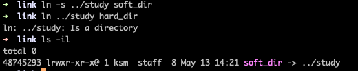 소프트 링크와 다르게 하드 링크 방식으론 디렉토리는 링크할 수 없고 파일만 링크가 된다는 사실을 알 수 있다.