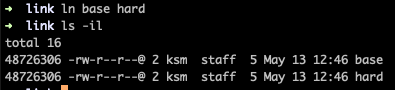 그 다음 `ln base hard`라는 명령어를 통해 하드 링크 파일 하나를 생성하였으며 둘의 inode 번호를 비교해보았다.