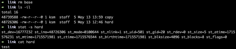 정리하자면 하드 링크는 원본 파일과 똑같은 파일 정보(inode, timestamp 등 모두 일치)와 파일 데이터로 링크가 되며 원본 파일이 삭제돼도 계속 유지된다는 특징이 있다는 것을 알 수 있다.