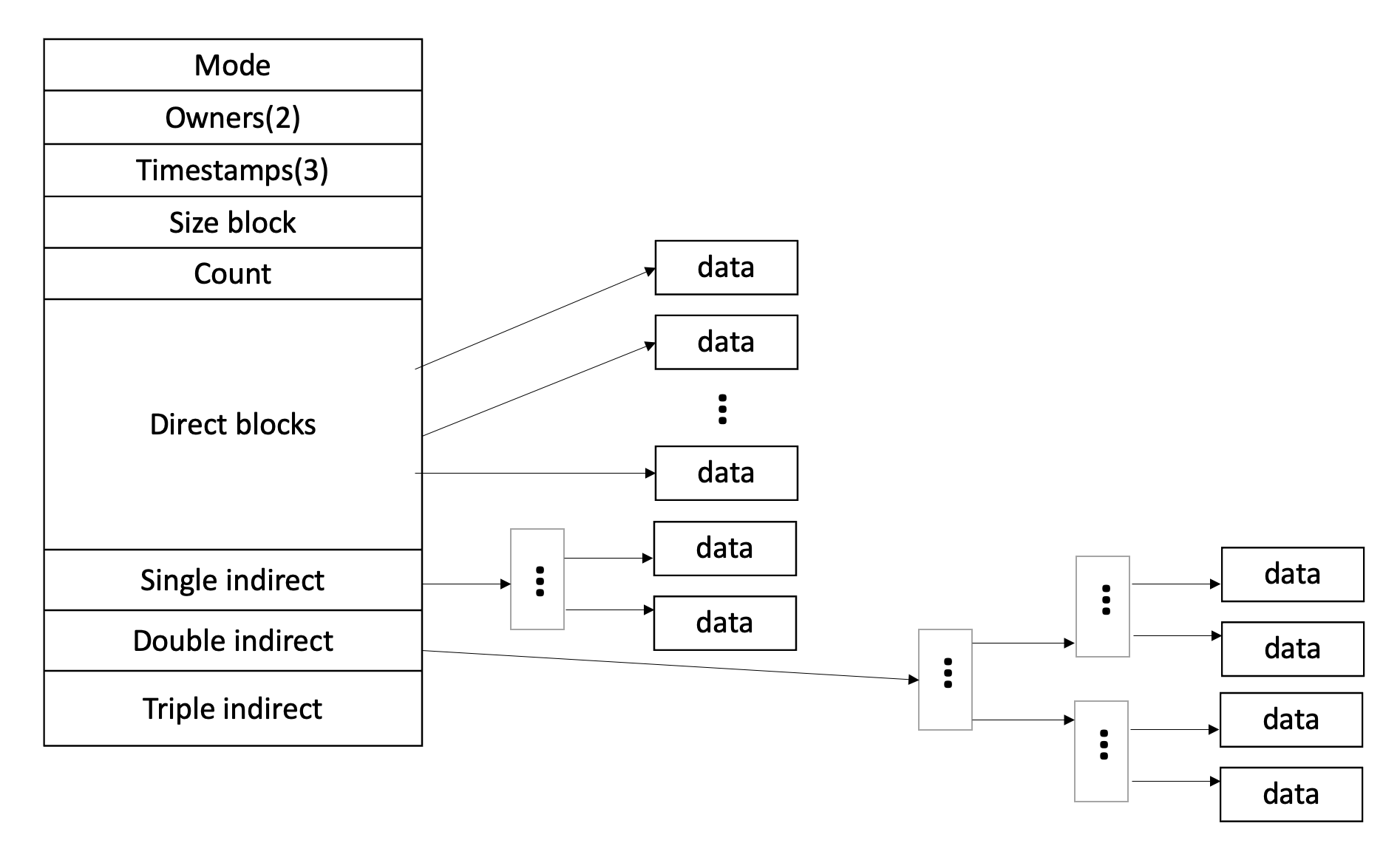 그림과 같이 inode는 파일의 권한 정보, 소유자 정보, 크기, 생성 및 수정 시간, 블록크기 등을 가지고 있다. 이때는 direct blocks은 파일의 데이터 블록을 직접 가리키는 주소가 저장되어 있으면 direct blocks만으로 부족할때는 single indirect로 다른 inode를 한번 거쳐 데이터 블록을 찾고 더 부족할 때는 double, triple 순으로 블록 포인터를 사용하게 된다. 즉, inode는 해당 파일에 대한 데이터가 있는 주소를 블록 포인터를 이용해서 갖고 있게된다.