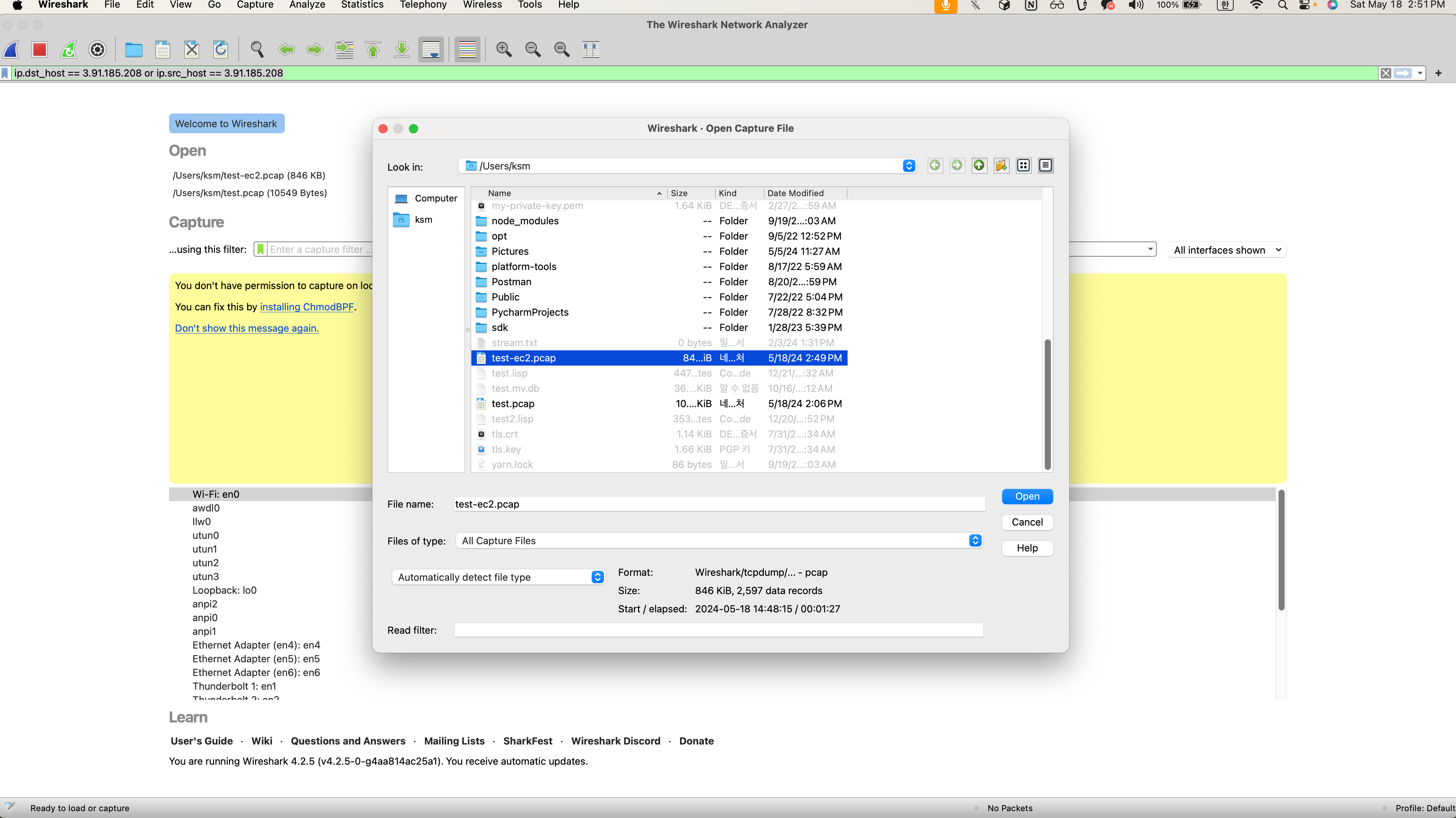 sudo tcpdump -i en0 -w test-ec2.pcap # 이때 permission 문제로 sudo로 해야 사용할 수 있다.