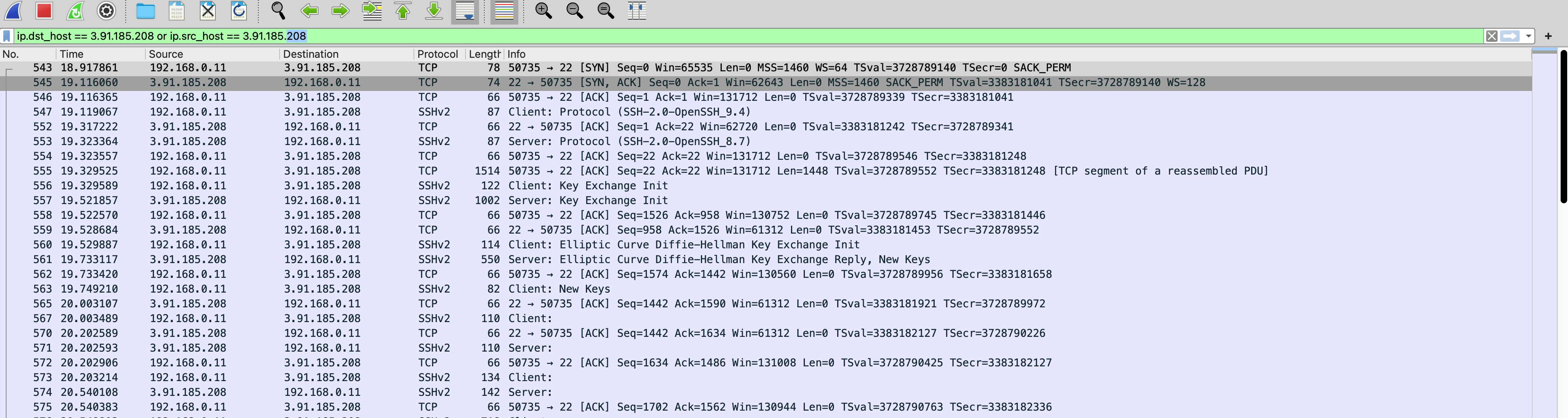 먼저 ssh 연결을 맺었기 때문에 아래처럼 ssh 연결에 대한 네트워크 패킷이 나오게 되고 자세한 info를 보면 client와 server간의 보안을 위한 연결을 설정한 것을 알 수 있다. (이외에도 네트워크 인터페이스에는 많은 패킷이 왔다갔다 하므로 filtering을 거는 것을 추천한다)